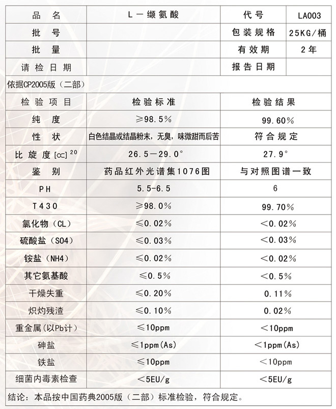 本品為白色結(jié)晶或結(jié)晶性粉末;用乙醇水溶液重結(jié)晶者為無色板狀或磷片狀結(jié)晶。無臭,有特殊苦味。熔點(diǎn)約315度。5%水溶液的PH值為5.5-6.5.對熱、光及空氣穩(wěn)定。易溶于水(8.85g/100ml,25度),幾乎不溶于乙醇和乙醚.與亮氨酸的分離困難。比旋度為+26.5°至+29.0°